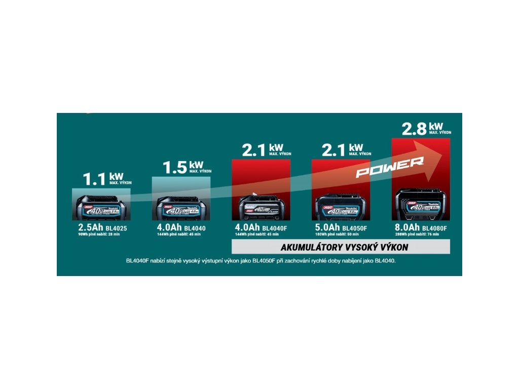 Baterie XGT jsou speciálně navrženy pro náročné použití na stavbách a splňují normu ochrany IP64. Digitální komunikace mezi baterií a strojem pro optimální výkon. Určeno pro stroje, které jsou často používány v nepřetržitém provozu. Zvýšená odolnost proti vodě a pádu díky robustnějšímu krytu a třem vnitřním ochranným vrstvám. Indikátor stavu baterie: Čtyři zelené LED s dotazovacím tlačítkem. Tento akumulátor nabízí při vysokém zatížení až o třetinu vyšší výkon ve srovnání s BL4040. Hmotnost akumulátoru je 1 kg, balení po 1 ks v kartonu.