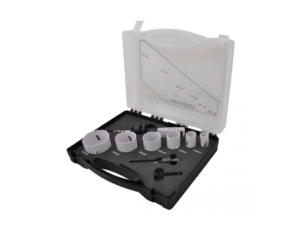 Sada obsahuje bimetalové vrtací korunky průměru 19, 22, 29, 38, 44 a 57 mm. Adaptér 6-hran 9 mm pro korunky 14-30 mm. Adaptér 6-hran 11 mm pro korunky 32-152 mm. Korunky vyrobené ze speciální oceli legované 8% kobaltem vhodné pro vyřezávání velmi přesných kruhových otvorů. Maximální hloubka řezu je 38 mm, upínání šestihran. Dodáváno v plastovém kufru.