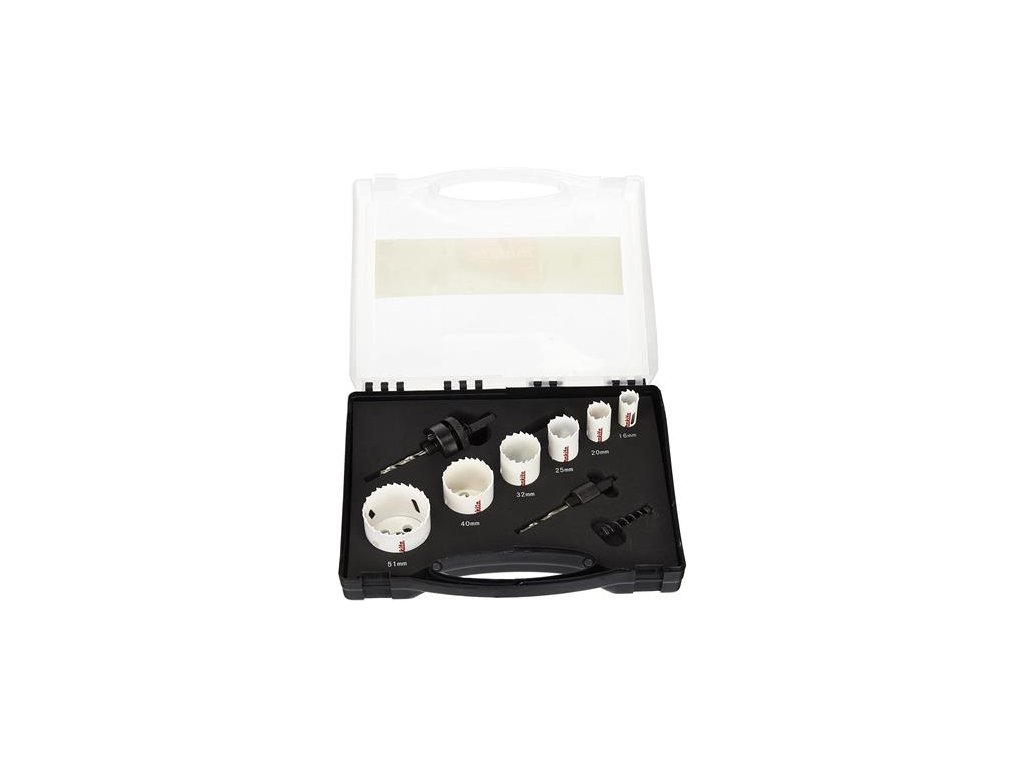 Sada vrtacích korunek o rozměrech 16, 20, 25, 32, 40 a 51 mm. Součástí balení jsou 2 adaptéry: 6hran 1/4" 14–30 mm a 6hran 1/4" 32–152 mm